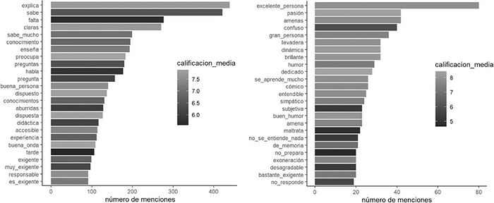 En síntesis, parece posible analizar la relación entre la calificación de un docente y el lenguaje utilizado por el estudiantado en sus comentarios, obteniendo información cuantitativa y cualitativa sobre qué cualidades del docente son atendidas por el estudiantado.