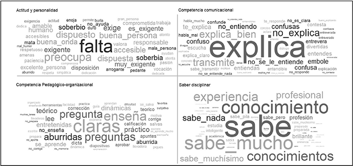La Figura 2 sintetiza información relevante para entender cualitativamente la variedad del vocabulario utilizado dentro de cada una de las categorías. Se aprecia que las referencias a la actitud-personalidad y la competencia pedagógico-organizacional tienden a mostrar una mayor cantidad de matices, mientras que las referencias a las características de comunicación y el saber disciplinar tienden a presentarse como variaciones de algunas fórmulas comunes (respectivamente “explica”/“se entiende” y “sabe”/“conoce”).