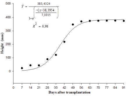 The marigold plants grew exponentially with time (Figure 1), and the maximum height was reached (approximately 37 cm) 53 days after transplantation, stable growth then followed. According to Gomes, Vieira and Heredia (2007), the heights of marigold plants increased linearly during their study, with the average maximum height of 34.02 cm at 120 days after transplanting. The results were consistent with Vieira, Heredia and Ramos. (1999), who found average heights from 29.9 to 39.9 cm in marigold plants fertilized with phosphorus and bed-of-avian; however, linear growth was observed during the study period 90 day cycle. Furthermore, Moreira et al. (2005) found variable plant heights from 28.82 to 39.24 cm in plants treated with five levels of nitrogen and phosphorus.