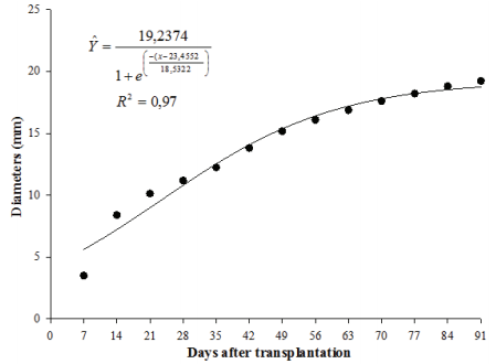 The early flowering coincided with a period of growth (approximately 15 days after transplantation), and the growth in plant height was promoted because of the expression of a large number of inflorescences, which is characteristic of the species (Ferri, 1986). Because marigold plants continue to grow even after the onset of flowering, in this species, vegetative and reproductive phases occurred simultaneously. For the stem diameters, the largest diameter of 20.0 mm was observed 60 days after transplantation. According to Figure 2, the diameter of the stem continued to increase through time, and 60 days after transplantation, the diameter had not reached a maximum; more time would be required to detect the largest diameter. The diameter of the stem is an important indicator of plant growth because it should continue to increase throughout development of the plant. The radial growth of the stem is necessary to provide strong support for the shoot. In some cases, an accumulation of reserves develops in the stems, and the translocation of assimilates would occur steadily to maintain the vital activities of the plant. Additionally, via the stem, plants absorb water and nutrients from the soil for continued growth.