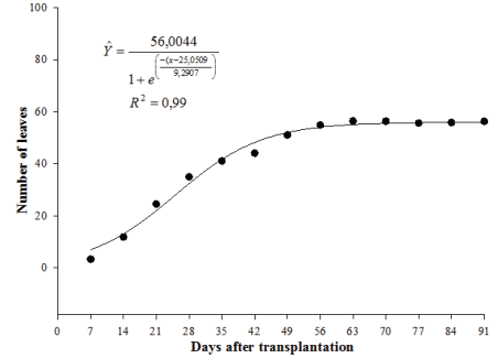 The number of marigold leaves increased exponentially (Figure 3) and had a similar growth curve to that of stem diameter, and after approximately 44 days, the increase in number of leaves stabilized. Leaves are an important indicator of production and determine the use of water by plants. Of major importance, the number of leaves is closely correlated with photosynthetic activity. During plant growth, the photosynthetic activity per leaf area increases with leaf age, until maximum expansion of the leaf, and then decreases thereafter until senescence (Taiz & Zeiger, 2006). If the plant is not in senescence and the soil is at field capacity, the normal supply of nitrogen to the leaves should occur, which increases the rate of photosynthesis and consequently the growth of the plant. Barman and Pal (1994) observed that the highest number of leaves per marigold plant was 146,10, which required 40 g m-2 mineral nitrogen; however, this relationship was not observed in this study because nitrogen was not applied to the soil and only organic fertilizer was used.