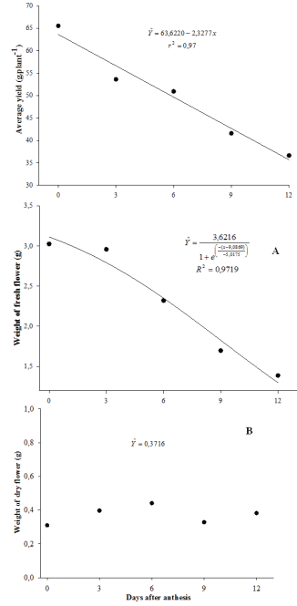 The productivity of marigold chapters in grams per plant is shown in Figure 4. The highest productivity of inflorescences occurred zero days after anthesis (DAA), shortly after anthesis, resulting in a considerable reduction of the loss of important features of these flowers. Additionally, with time, productivity decreased because there was a great loss of parts or all of the flowers as a consequence of the initiation of flower senescence, which caused the gradual loss in characteristics of quality, such as color, appearance and integrity (Figure 4A). At the last harvest of the season (12 DAA), the drop of ligulate flowers and the general aging of the flower were evident, thus beginning the process of seed formation.