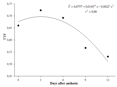 The total flavonoid content was highest in marigolds 3.04 days after anthesis, accounting for approximately 0.70% of total flavonoids (Figure 5), calculated as hyperosides (C21H20O12). According to the monograph of calendula described in the Farmacopéia Brasileira (Farmacopéia Brasileira, 2002), the drug in marigold plants is found in whole or ground ligulate flowers along with a few tubular flowers, separated from the receptacle and involucral dried bracts. The desiccated sample must contain no less than 0.4% of total flavonoids, calculated as hyperosides (C21H20O12). Therefore, in this study, all marigold samples met the limit suggested by the pharmacopoeia.