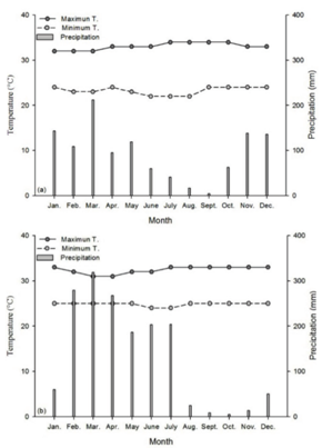 Two experiments were conducted in the State of Maranhão (MA), one in the Center Region, in an area of family-based agriculture at Dom Pedro (MA), elevation 171 m, latitude 5° 05'S, longitude 44° 21' W, with typic Dystrophic Red-Yellow Argisol, and one in the North Region, at the Federal Institute of Education, Science and Technology of Maranhão (Instituto Federal de Educação, Ciência and Tecnologia do Maranhão - IFMA), São Luís Campus, Maracanã, at São Luís, Maranhão State, elevation 41 m, latitude 2° 36'S, longitude 44° 16'W, with typic Dystrophic Yellow Latosol, between June and September 2013. The climate of the first region is sub-humid (C2W2A'a'), and that of the second region is humid (B1WA'a'), according to the Thornthwaite classification. Minimal and maximal temperature, and rainfall data for the duration of the experiments are presented in Figure 1. The chemical characteristics of the soil at 0-20 cm are shown in Table 1.