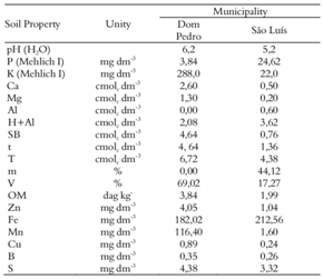 At Dom Pedro, there was no need for correction of soil acidity. Plantation fertilization was performed with application of 90 kg ha-1 P2O5 as triple superphosphate (45% P2O5). Potassium was not applied because the soil analysis revealed high potassium content. At São Luís, 2.53 t ha-1 dolomitic limestone, 40 kg ha-1 P2O5 as triple superphosphate (45% P2O5), and 40 kg ha-1 K2O as potassium chloride (60% K2O) were applied. The need for liming for neutralization of soil acidity was determined by increasing the base saturation to 70%.