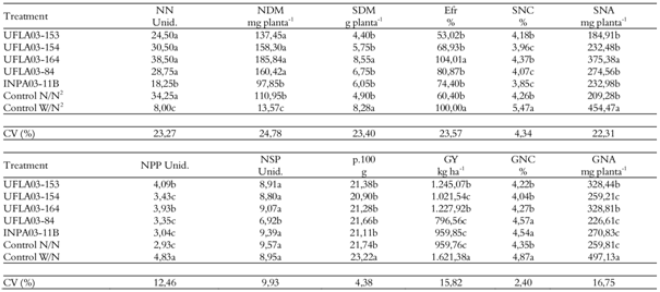 The treatments could be divided into three significantly different groups (p < 0.05) based on the grain N content (Table 3). The first group with the highest N content consisted of the uninoculated treatment with mineral N supplementation and UFLA03-153. The second group consisted of the treatments UFLA03-154, INPA03-11B and the control without mineral N supplementation. The last group consisted of the treatments inoculated with strains UFLA03-164 and UFLA03-84 (Table 3).