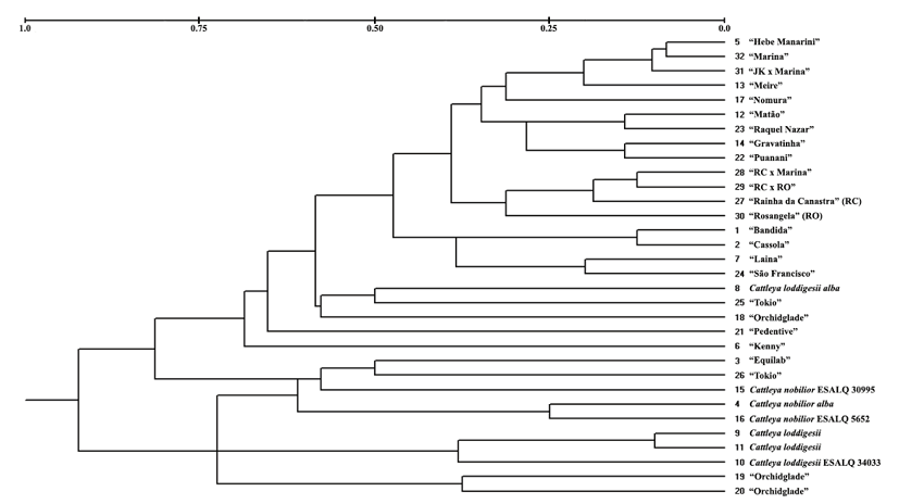 Our analysis revealed smaller genetic distances between the “Orchidglade”, “Equilab”, “Kenny” and “Pedentive” clones and the species C. loddigesii and C. nobilior. Our results also showed that native plants of C. walkeriana are genetically more distant from C. loddigesii and C. nobilior.
