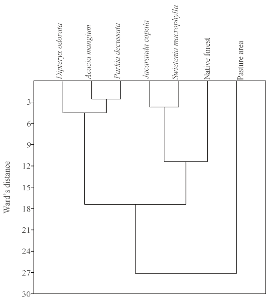 The hierarchical clustering dendrogram obtained from the multivariate analysis indicated that J. copaia and S. macrophylla formed a group with high similarity (lower distance between connections) with the native forest (group 1) compared to the other ecosystems (Figure 1). In contrast, A. mangium and P.decussata formed another group with high similarity to D .odorata (group 2). These groups (1 and 2) presented low similarity to each other because the distance of connection between them (approximately 18) was greater than half of the total connection distance (30) that linked all of the types of land use (Figure 1). Moreover, the forest ecosystems (monospecific plantations and native forest) formed a macro group (group 3) in which the distance of connection to the pasture area was equal to 27, i.e., next to the value of the connection that encompassed all of the seven ecosystems. Thus, the soil chemical attributes showed that the pasture presented the highest dissimilarity to the forest ecosystems.