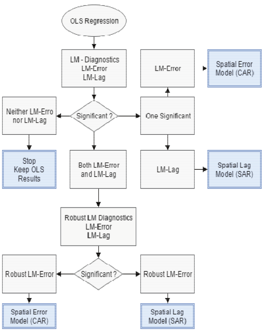 A decision process is conducted to determine the most appropriate model (OLS, SAR or CAR) to estimate the spatial data (Anselin, 2005; Song et al., 2014), which is illustrated in Figure 2.