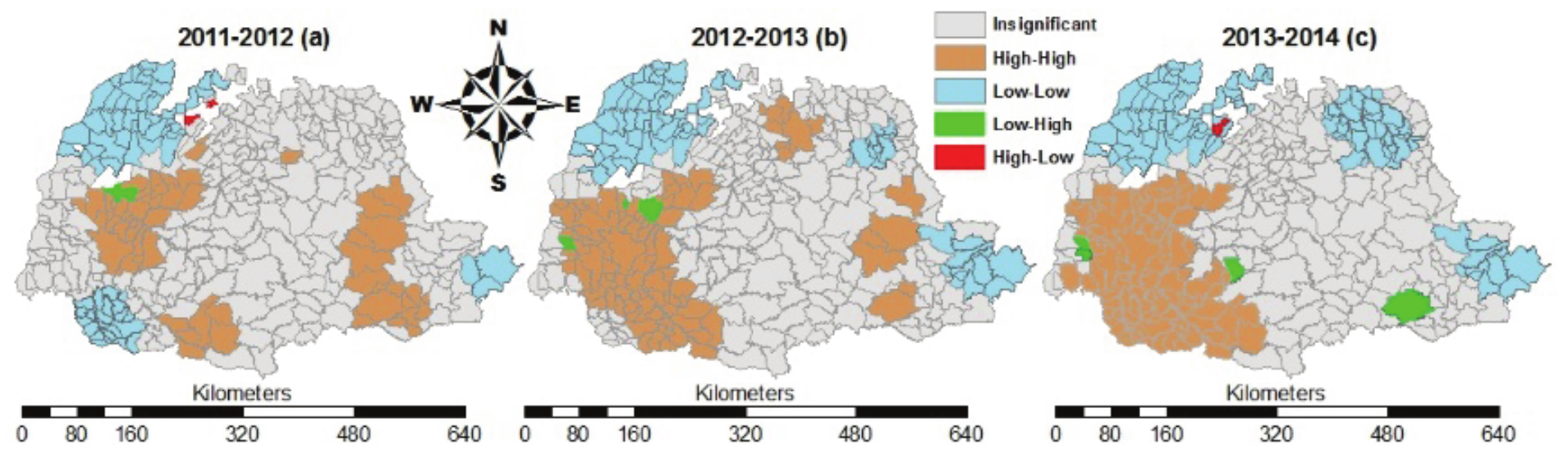 The LM Lag, LM Error, Robust LM Lag, and Robust LM Error statistical tests indicated the best spatial regression model for each year. The SAR model was recommended for 2011/2012 and 2012/2013 (Robust LM Error: 0.89 > 0.05; Robust LM Error: 0.051 > 0.05). For 2013/2014, both the SAR and the CAR models were recommended, and both models were used in this case. This criterion for the selection of the best regression model is also discussed in the studies conducted by Anselin (2005) and Song et al. (2014).
