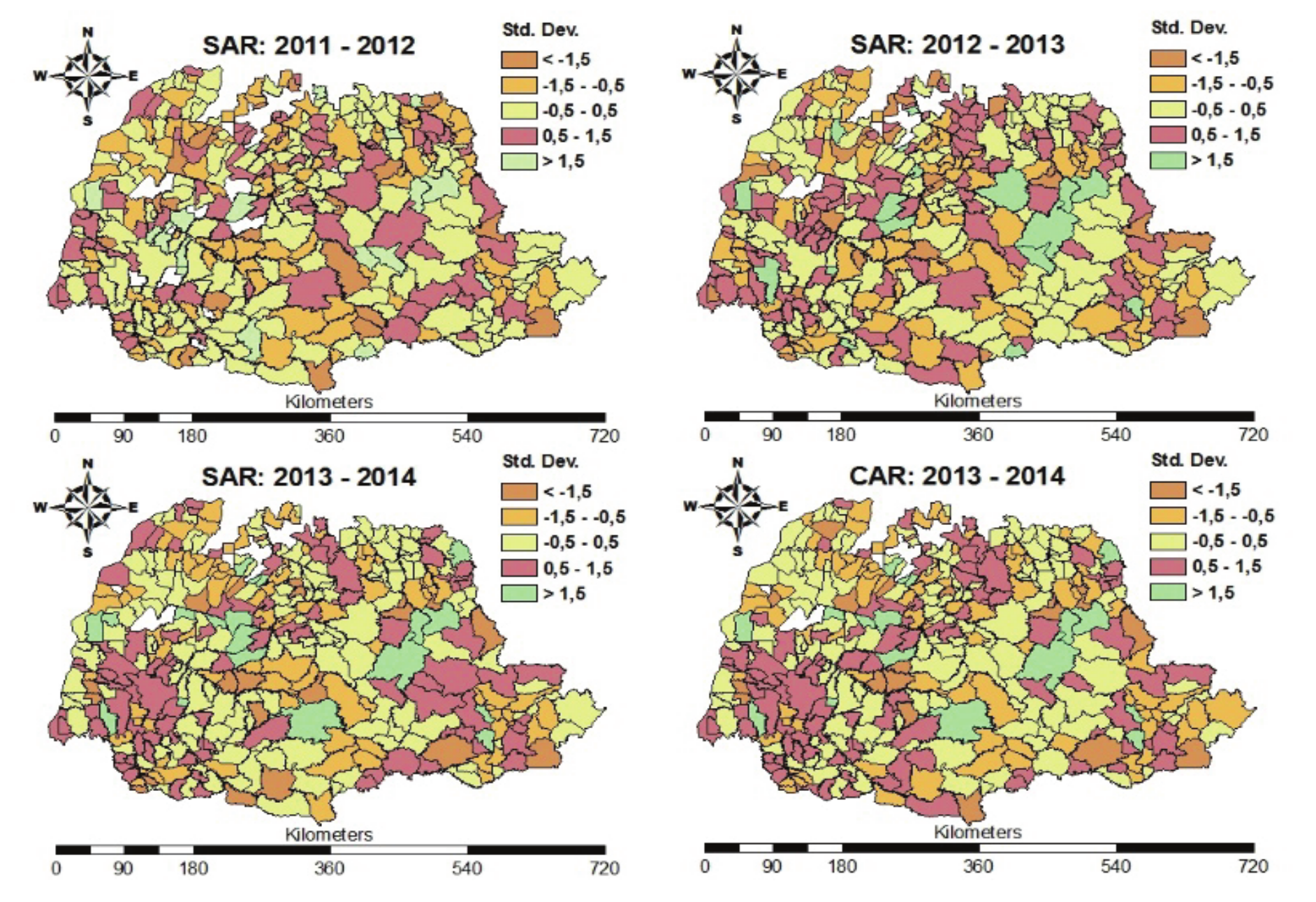 For 2011/2012: (I) = -0.0031, E(I) = -0.0028, P-value = 0.498 and z-score = 0.0042; for 2012/2013: (I) = 0.0020, E(I) = -0.0028, P-value = 0.442 and Z-score = 0.1784; and for the 2013/2014 SAR model: (I) = 0.0192, E(I) = -0.0028, P-value = 0.202 and Z-score = 0.8302. For the 2013/2014 CAR model: (I) = -0.0051, E(I) = -0.0028, P-value = 0.471 and Z-score = -0.0917; the Moran’s I indicated that the residuals are randomly distributed in space, and the z-score is not significant at the 5% level, so the null hypothesis related to the residuals random distribution is accepted. This indicates that the inclusion of the WY component to the models almost eliminated the spatial dependence, meaning that the angle of inclination of the straight line that represents Moran’s I in the scatter diagram was very small. Therefore, the regression models generated residuals that were randomly distributed over the study area, as seen in Figure 4, which represents the map of the standardized residuals generated by the standard-deviation method, resulting from the application of the SAR model (2011/2012, 2012/2013, and 2013/2014) and CAR (2013/2014).