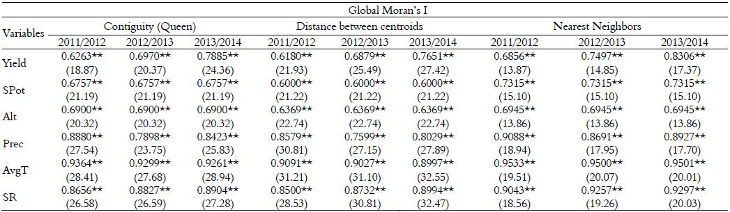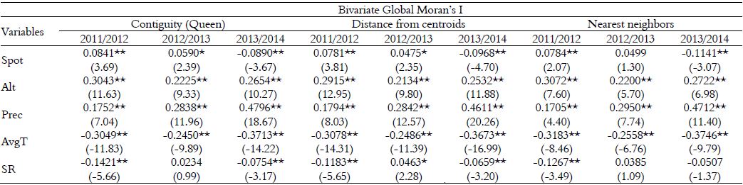 The spatial association of corn yield (t ha-1) with the other study variable can be seen in Table 2. According to the calculated value for the bivariate Moran’s I, the variables Alt, Prec and AvgT had significant spatial correlation at the 1% level for all years studied (i.e., 2011/2012, 2012/2013, and 2013/2014) and the neighbourhood criteria (i.e., the queen contiguity, the distance between centroid and the nearest neighbours). The variable AvgT exhibited a negative spatial association, and the others were positive. The SPot variable exhibited a positive spatial association at respective significance levels of 1% and 5% for 2011/2012 and 2012/2013, except for the spatial proximity of the nearest neighbours, which were not significant at the 1% or 5% level. However, for 2013/2014, the SPot variable resulted in a negative and significant spatial correlation, different from the others that had a positive correlation. The variable SR indicated a negative and significant correlation at the 1% level in 2011/2012, and in 2012/2013 a positive and significant spatial correlation existed only for the criterion related to distance between the centroid and its neighbours and was non-significant for the other variables. In 2013/2014, a significant spatial association at the 1% level was present for the neighbourhood criteria, i.e., the queen contiguity and the distance from the centroid, but in the other years, these showed no significance.