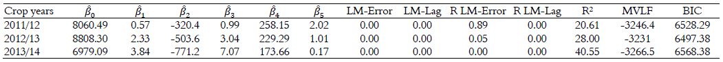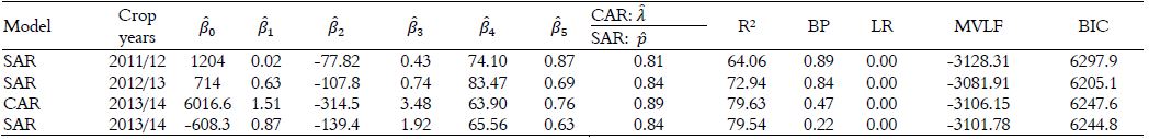 Application of the SAR regression model for 2011/2012, 2012/2013, and 2013/2014 and the CAR model for 2013/2014 was the most appropriate compared to the OLS regression model. The coefficient of determination (R²), the Bayesian information criteria (BIC) and the maximum value of the logarithm of likelihood function proved to be better for the estimation of corn yield.