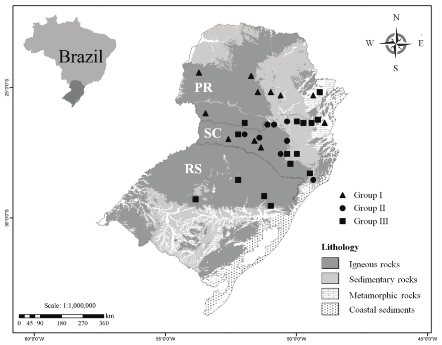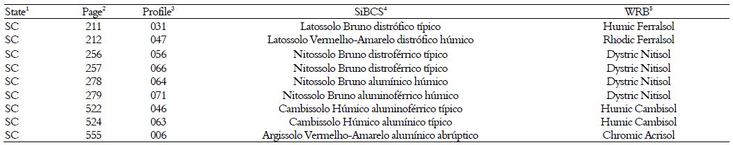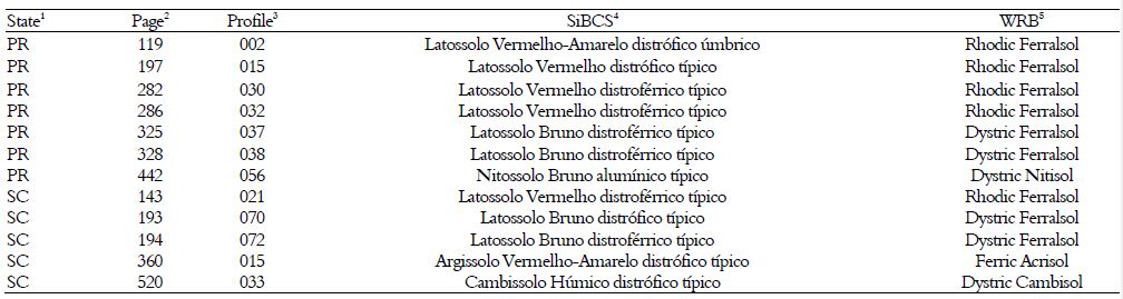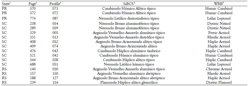 This study was developed based on the following three soil surveys of the southern region of Brazil: 1) Soil Recognition Survey of the Paraná (Embrapa, 1984); 2) Soil Recognition Survey of the Santa Catarina (Embrapa, 1998); and 3) Soil Recognition Survey of the Rio Grande do Sul (Brasil, 1973). These surveys were conducted between the 1960s and 1990s and covered the territory of each southern Brazilian state. Soils were carefully chosen to adequately represent the taxonomic unit in terms of morphological, chemical, and physical attributes along the profile for classification. Regarding soil characterization, it is important to note that standard methodologies were used to evaluate soils in all surveys.