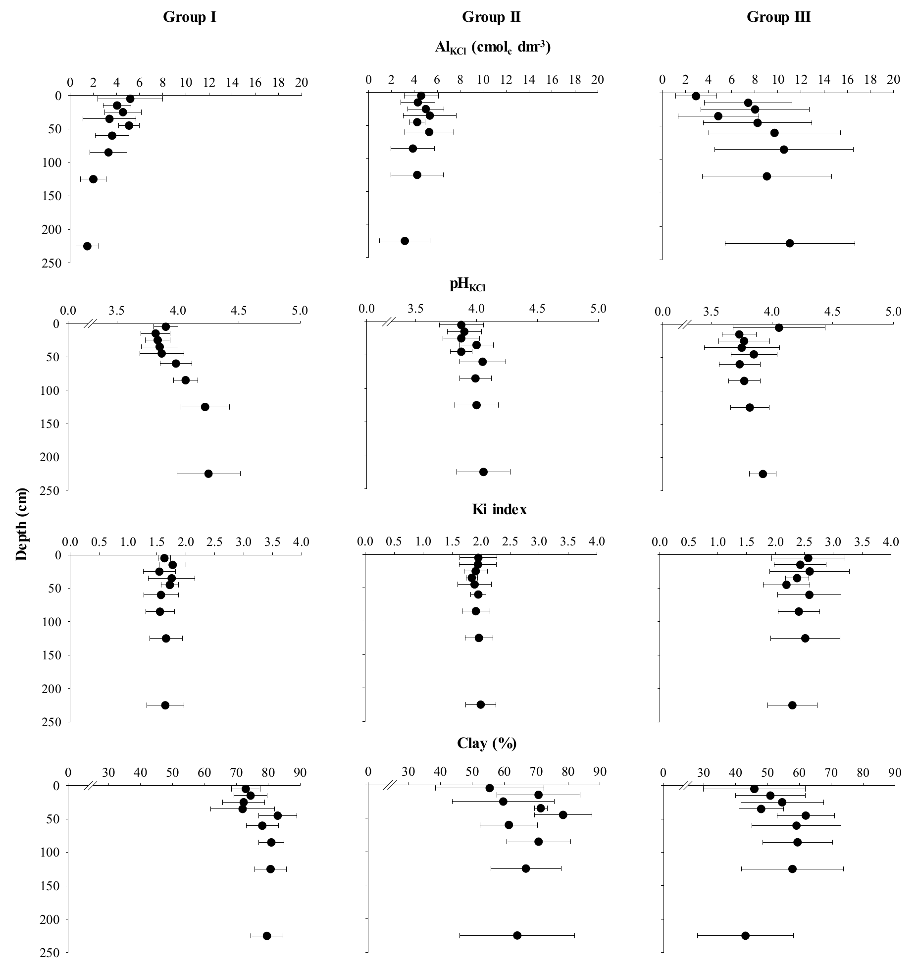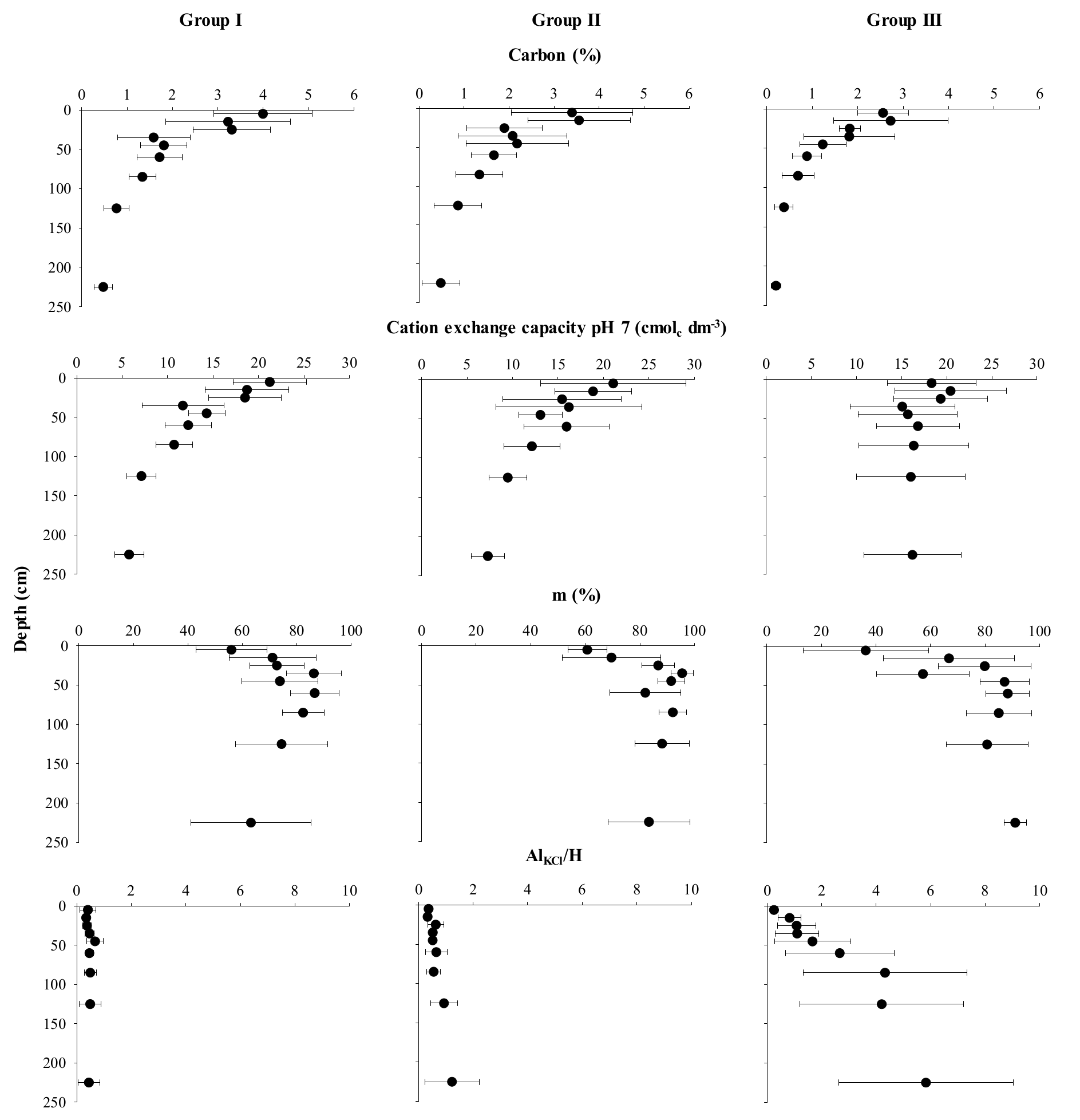 Regardless of group, saturation by AlKCl (m) increased as a function of soil depth (Figure 3). However, the highest m values occurred through different routes, particularly for more contrasting groups (I and III). For Group I, reduced variation in AlKCl (below 60 cm) indicated increased mean m values up to this layer and was a reflection of reduced CEC with depth. For Group III, the increase in m values with depth followed significant increases in AlKCl along soil profiles.
