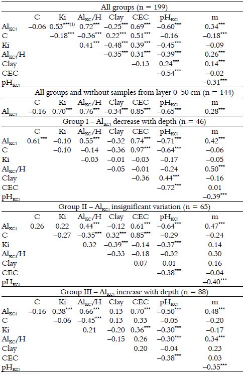 According to these premises, the degree of soil weathering was classified intense to very intense for Group I and moderate to intense for Group III, which corroborated Ki index results (Figure 2). The expressed variation in average Ki levels among groups allowed for the establishment of positive correlations with AlKCl content considering all samples (0.53, p < 0.01) or excluding those in the 0-50 cm depth range (0.70, p < 0.01; Table 4). Analysis of only subsurface diagnostic horizons increased the correlation coefficient between Ki index and AlKCl content, since the effect of surface horizon organic matter on AlKCl dynamics in soil was isolated. When soil groups were considered separately, correlation coefficients were less than 0.4, since Ki values were similar along the soil profiles within each group (Figure 2).