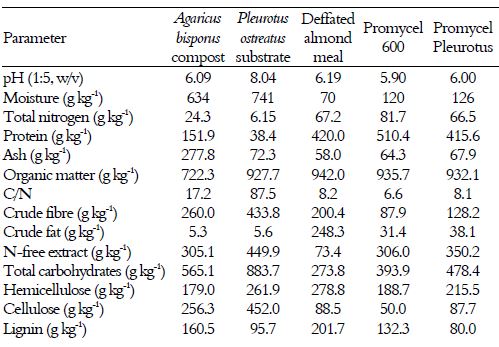 Among the supplements used for Agaricus, it is remarkable the lower protein content of the almond meal (420.0 g kg-1) compared to the control Promycel 600 (510.4 g kg-1). Higher crude fibre (200.4 vs 87.9 g kg-1) and much higher crude fat (248.3 vs 31.4 g kg-1) contents have been detected. Additionally, we highlight a lower total carbohydrate content (273.8 vs 393.9 g kg-1). The higher hemicellulose, cellulose and lignin contents represent a lower neutral detergent-soluble fibre content (373.1 vs 564.6 g kg-1).