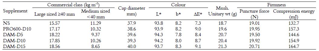 Larger sizes are usually preferred by farmers due to the fresh market demand and the reduction of labour costs in harvesting; however, medium sizes may be preferable by facilities prepared for mechanical harvesting and canned industry. Typically, high yields are associated with high fruiting rates. Thus, when the number of harvested mushrooms increases, the mushroom size decreases (Pardo-Giménez et al., 2012). This statement is consistent with our results. Besides, the mushroom dry matter content is a parameter of special interest because it directly reflects the quality and commercial lifetime. Mushrooms with a high dry matter content, most likely the button mushroom cultivated with DAM supplementation, show a firmer texture, a higher nutritional value and a lower sensitivity to microbial spoilage (Diamantopoulou & Philippoussis, 2015).