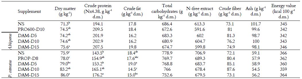 The supplement of DAM shows a remarkable higher crude fat content (248.3 g kg-1) compared to the reference Promycel Pleurotus (38.1 g kg-1) used for Pleurotus (Table 1). Notably, the lower nitrogen-free extractive (73.4 vs 350.2 g kg-1), total carbohydrate (273.8 vs 478.4 g kg-1) and neutral detergent-soluble fibre contents (373.1 vs 548.9 g kg-1) should be highlighted; the latter effect was due to the higher hemicellulose content and, particularly, higher lignin content.