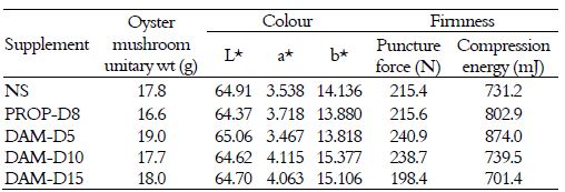 In fact, considering the relation between the dry matter content and the texture, a lower puncture force and compression energy have also been obtained with mushrooms using a non-supplemented substrate (19.01 N and 132.7 mJ, respectively) (Table 2). Similarly, higher breaking strength and compression energy were obtained for mushrooms produced with the substrate supplemented with the highest dose of almond meal (20.71 N and 164.7 mJ, respectively), although the differences were not significant. Neither significant differences were found regarding the colour of the carpophores (Table 2).