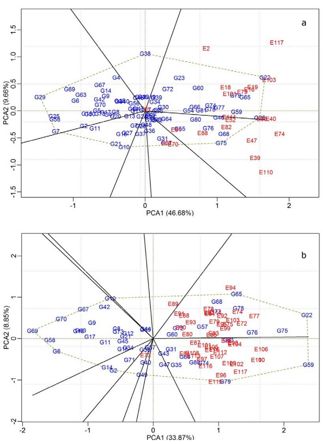 It was verified that in these scenarios, the GGE-biplot explained a greater proportion of variation due to G+GE with respect to the joint analysis, with values of 56.34% and 42.72%, respectively (Figure 5a and b). Similar results were reported by Balestre, Von Pinho, Souza, and Oliveira (2009) and by Oliveira, Von Pinho, Balestre, and Ferreira (2010) when they observed values of 53.82% and 51.5% for the variation due to G+GE that was explained by the first two principal component GGE biplots of the respective studies.