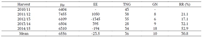 During the covered period (2010/11 - 2014/15 crop seasons), a renewal rate of genotypes of approximately 31% was observed, which indicates good dynamism of the breeding program (Table 1).