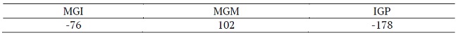 where: GPI(i+1) is the genetic progress due to introduction in year i+1 for i = 1, 2; MGM(i;i+1) is the mean of the genotypic values (BLUPs) of the selected genotypes from year i to year i+1; and MGI(i+1) is the mean of the genotypic values of the genotypes introduced in year i+1 for i = 1, 2. This criterion measures the gains of the introduced genotypes over the best genotypes that were selected in the previous VCU tests.