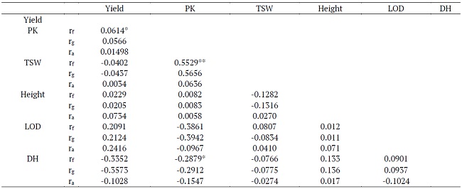 The genotypic, phenotypic and environmental correlations between the evaluated characteristics were mostly non-significant and of low magnitude. Generally, pleiotropy and close linkage are the two major reasons for genetic trait correlations and are often confounded at the level of genes (Gardner & Latta, 2007). The highest correlation was observed between TSW and PK, which indicates that the larger the grains were, the higher the weight of the grain mass was. An important absence of correlation was observed for DH x Yield, which shows the potential for obtaining genotypes that are both early and of high yield (Table 2). Weak correlations but with the same signal of this experiment between traits were obtained by Raham (2015). Other studies under irrigated conditions of Cerrado showed correlations similar to those obtained in this study (Amabile et al., 2015; Sayd et al., 2017).