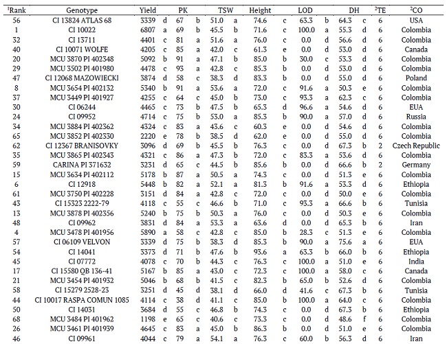 The values obtained are considered precocious when compared to Palestinian varieties that showed a DH ranging from 88 to 112 days (Shtaya et al., 2015), 20 Ethiopian genotypes (74 to 100 days) evaluated by Ebrahim, Shiferaw, and Hailu (2015), 36 Ethiopian varieties that showed a DH ranging from 65 to 92 days (Addisu & Shumet, 2015), and even more compared to winter genotypes with a cycle of 180 days (Sameri, Takeda, & Komatsuda, 2006).