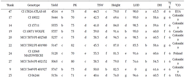For all the characteristics evaluated, the values of F were above 5.26, which is the value suggested by Steel and Torrie (1980) that will allow one to make a safe statistic inference and to indicate a high selective accuracy. The values of F for the effect of genotypes ranged from 7.6 (Yield) to 50.4 (TSW), thus showing the existence of differences among the means of the accessions. The values of F for the effect of environment ranged from 17.4 for DH to 162.7 for TSW, and the values for the G x E interaction ranged from 5.2 (Yield) to 24.5 (Height) (Table 1).