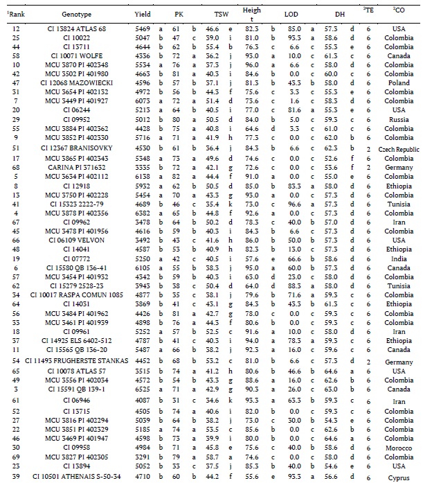 The German two-row cultivars CARINA PI 371632 and CI 11493 FRUGHERSTE STANKAS and the six-row Colombian genotypes MCU 3832 PI 402310 and MCU 3452 PI 401930 were highly resistant to lodging in all trials (Tables 3, 4, and 5). Among the 69 genotypes evaluated, 28 had LOD values below 30%. The selection of shorter and more lodging-resistant genotypes reduces the production costs. This reduction can be attributed to not using growth reducers for crop management. The characteristic LOD had great variation among the trials due to the climate differences among the years evaluated. In 2013, when there was the highest rainfall, the lowest CEV was observed, and in general, the genotypes presented the highest percentage of lodging. In 2012 and 2014, the LOD values were lower, allowing a higher variation of the genotype performances. It is important to emphasize that the correlation between lodging and Yield was low and not significant (Table 2), as observed by Amabile et al. (2015). This result indicates the feasibility of selecting genotypes with high yield and low lodging levels.