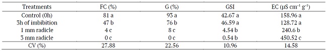 The highest percentage of germination in the first count was obtained from control seeds. For seeds subjected to three hours of imbibition followed by dehydration and rehydration, the percentage of normal seedlings at the first count decreased, showing a negative effect on seed vigor.