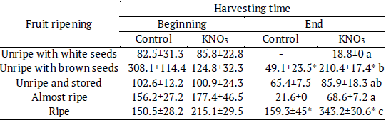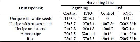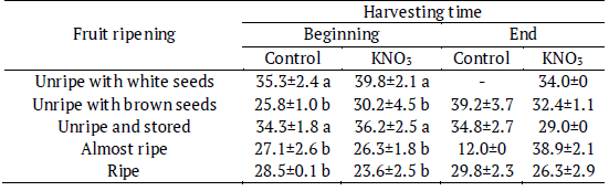 Vigor index was similar in seedlings of fruits harvested at the beginning or the end of the fruiting season (KW, p = 0.26). However, at the end of the fruiting season, the VI was higher in seedlings of ripe and unripe fruits with brown seeds soaked in potassium nitrate (F = 31.43, p < 0.0001) (Table 3) than in the others fruit ripening stages.