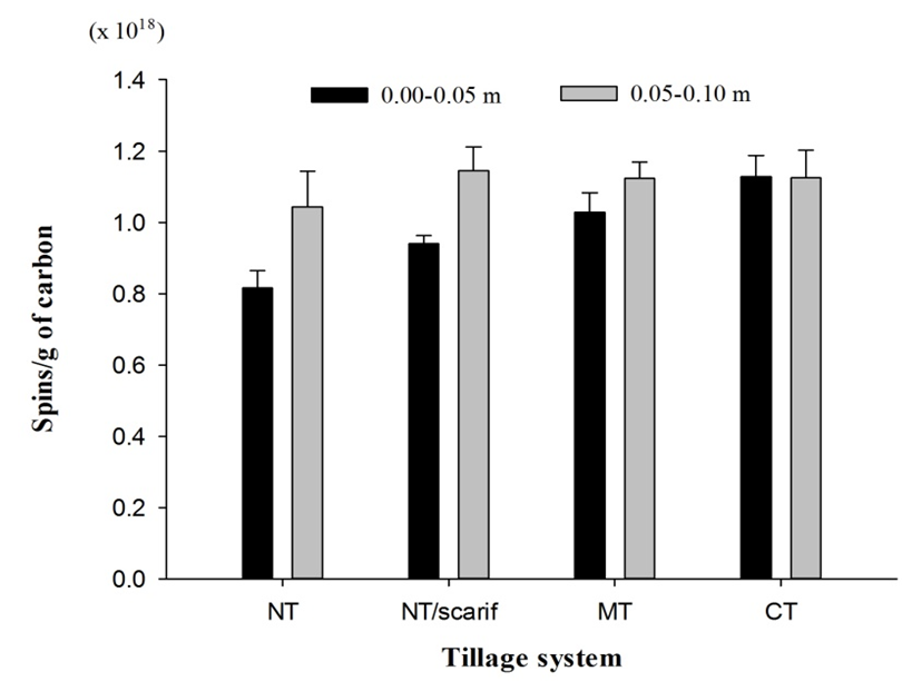 The rapid decomposition of crop residues on the surface of soils under CT leads to the synthesis of high-molecular-weight stable polymers in the soil. In contrast, the decomposition of OM in the NT system is slower, leading to the coexistence of HS of various molecular sizes (or molecular weights) and chemical compositions (Evangelou and Marsi, 2001). In the present study, there was a tendency for soils under NT to have a lower amount semiquinone free radicals (Figure 1) and, therefore, lower synthesis of stable polymers in the soil. Thus, the OM content was lower in the surface layer of the soil conventionally tilled (Tables 2 and 3) but showed a higher degree of humification, as reflected by the greater number of semiquinone free radicals.