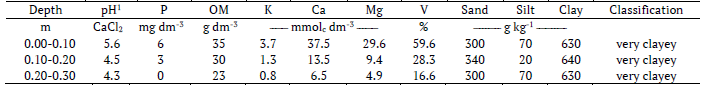 The soil was cultivated with soybeans under CT for many years (Glycine max L. Merr.) before starting the experiment. In the winter of 1988, the soil acidity was corrected with the application of 7,300 kg ha-1 of lime incorporated 0.35 m deep with a moldboard plow. The chemical and physical characteristics of the soil samples after the liming of 1988 are shown in Table 1. In the winter of 1992 and 1994, two other surface lime applications of 2,000 kg ha-1 each were carried out.