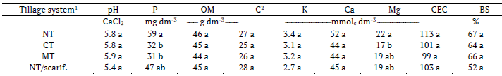 The absence of variation in the Ca and K levels and small variation of soil Mg found in the present study explains why the tillage system did not modify the CEC and BS% of the soil (Tables 2 and 3), since these two parameters are a function of the content of those nutrients. A higher BS% with more Ca, Mg, or K would be linked to a higher soil pH, which would increase the pH-dependent colloidal charge and thus CEC, but this effect was not observed. Specifically, it was expected that CEC would be modified by the tillage system at least in the 0.00-0.05 cm layer of NT soil due to the higher amount of OM in this layer (Table 2), as observed by Lal, Mahboubi, and Fausey (1994). In turn, Tarkalson et al. (2006) observed an increase in CEC but a reduction in Ca, K, and BS% in the soil under NT. They explained this result by the greater removal of nutrients from the soil due to the higher yields under NT compared to that from soils under CT.