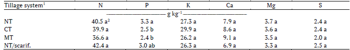 The concentrations of P in the analyzed leaves of plants grown under the NT system were higher than those of plants under the systems with the highest turnover (CT and MT) (Table 4). It should be noted that in these two cases, P concentrations were below the levels suggested as adequate by Malavolta et al. (1997) (2.6 to 5.0 g kg-1). Soils under NT have a higher moisture content in the surface layer than soils under CT, which favors the diffusion of P to the plant roots. Contrary to what was found in the present study, Nielsen and Woodard (2015) did not observe differences in leaf concentration of P in plants grown under NT and CT. According to the authors, these results could have been much different in a warmer season where growth could have been stimulated to a greater extent. Cooler than normal soil conditions in the early part of the growing season probably slowed the diffusion rate of nutrients.