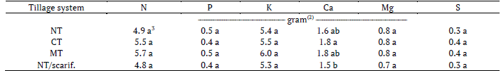 The K content was not modified by the tillage system (Tables 2 and 3), and there was no increase in the concentration of this nutrient in the surface layer (Table 3), as observed in other studies (Motta, Reeves, & Touchton, 2002; Sainju, Allen, Caesa-Tonthat, & Lenssen, 2015; Martínez et al., 2016). However, a number of researchers have documented higher levels of K in the surface layer of soils under CT than under NT (Edwards et al., 1992; Tarkalson et al., 2006; Sainju et al., 2015). These divergent results may be due to variations in the quantity of K exported by the crops used in the experiments, as well as variations in the application rates of the fertilizers and leaching conditions at the different experimental sites (Motta et al., 2002). The differences in clay content and composition among the soils of the experimental sites can also explain the divergent results. It is known that potassium is not part of the organic constituents of plant residues. Thus, K salts in the residues are readily washed out by rainfall and subsequently leach downward in the soil profile, as observed by Tarkalson et al. (2006) in the soil under NT and CT. Thus, no relationship would be expected between residue inputs with NT and K levels in the surface soil.