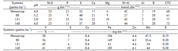 The experimental units were fertilized with nitrogen (N) as urea at 150 kg ha-1 year-1, phosphorus (P2O5) as single superphosphate at 150 kg ha-1 year-1, and potassium chloride (KCl) at 60 kg ha-1 year-1. Finally, depending on the silvopastoral system, dolomitic lime was added at 550, 135, 775, and 630 kg ha-1 to the palisade grass monocrop and the three palm-tree densities (80, 131, and 160 palms ha-1), respectively.