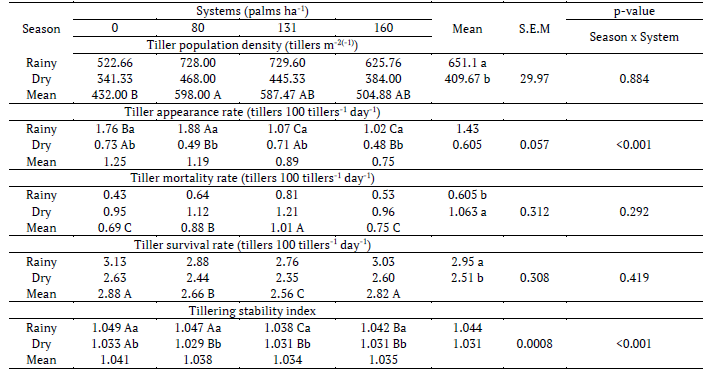 There was interaction (p < 0.001) between the seasons and systems for the appearance rate of basal tillers. In the rainy season, the highest appearance rate of basal tillers was found in the system with 80 palms ha-1 and the lowest in the systems with 131 and 160 palms ha-1. In the dry season, the highest appearance rate of basal tillers was observed in the monocrop and in the system with 131 palms ha-1. The mortality rate was higher during the rainy season (p < 0.001) and, among the systems, was highest in the monocrop and the 160 palms ha-1.