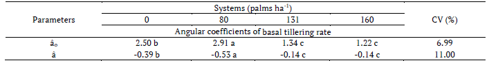 The values of the angular coefficients for the basal tillering rate of each system across the generations are listed in Table 3, where it can be observed that the system with 80 palms ha-1 presented the highest angular coefficient for basal tillering rate.