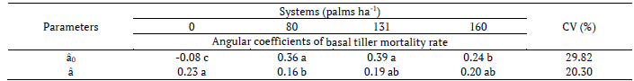 The values of the angular coefficients for basal tiller mortality rate of each system across generations are presented in Table 4, where it can be observed that the system with 131 palms ha-1 presented the highest linear coefficient for the basal tiller mortality rate, while the monocrop system had the highest angular coefficient for the basal tiller mortality rate.