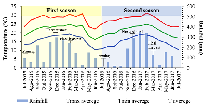 The area accumulated 0,0 chill hours (CH) ≥ 7.2ºC and 58.6 HF ≥ 13ºC from 1 April until 31 July, 2015 (first season). While in 2016, in the same period, the accumulation of CH was 7.4 ≥ 7.2°C and 473.7 ≥ 13°C (second season). Other climatic data of the experiment period are shown in Figure 1.