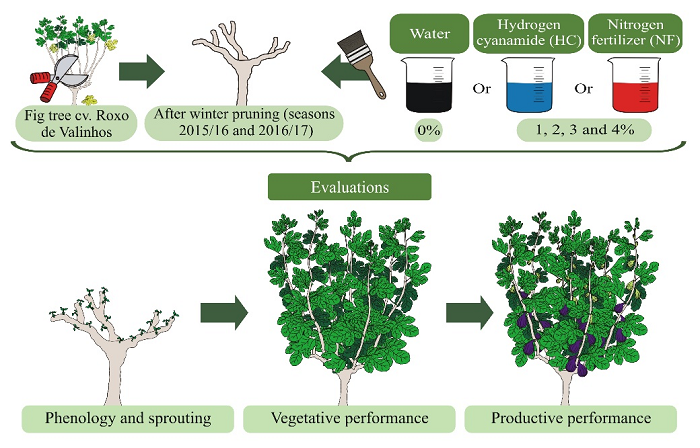 There are several products to promote the overcome dormancy. However, the hydrogen cyanamide has stood out due to its expressive outcomes. There is paucity in literature on use these products in fig crops (i.e. Roxo de Valinhos cultivar) in Brazil. Norberto, Chalfun, Pasqual, Veiga, and Mota (2001) observed that hydrogen cyanamide (2%) associated with May pruning and irrigation promoted early harvests and higher yields. Leonel, Tecchio, and Cóser (2015) found that the application of hydrogen cyanamide 2% promoted sprouting anticipation, and when use with garlic extract, it also promoted productive period concentration.