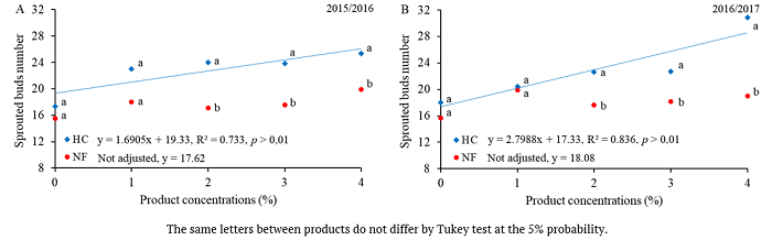 With regards to the number of days to bud sprouting, results were only significant on both seasons’ concentrations. Since number of days decreased linearly as a result of the increase in product concentrations during the first cycle, while there was a quadratic decrease to the concentration of 3% in the second cycle (Figure 3A and B). Such result is related to the climatic variability between productive cycles, which have a direct impact on products effects. In the second cycle, there were smaller peaks of minimum temperature, in other words no need for higher doses; consequently, a quadratic effect was observed.