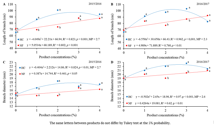 The interaction occurred between products and concentrations of all characteristics in 2015/2016 season (Figure 5 and 6). However, there was interaction between products and concentrations only for branch length and diameter in 2016/2017 season (Figure 5).
