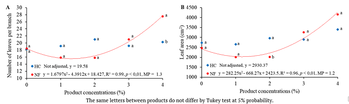 There was no interaction between products and concentrations for number of leaves per branch and leaf area in 2016/2017, as well as there was no isolated effect of the factors. During this season, the average number of leaves and leaf area were 5.6 and 826 cm2, respectively.