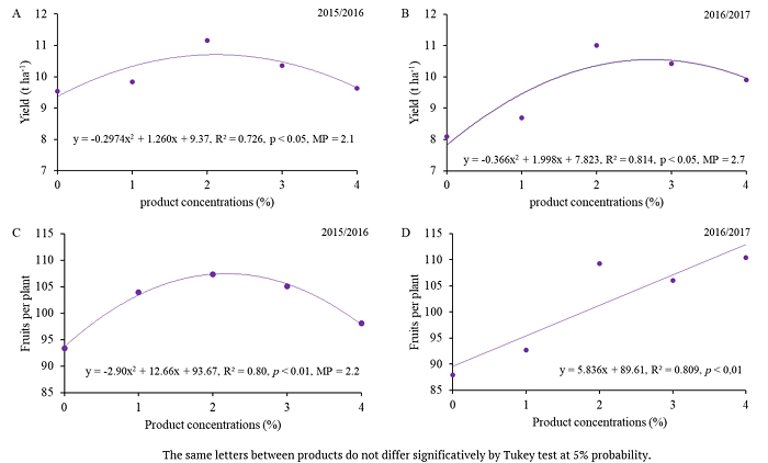 With regards to concentrations, there was an increase of 12.2% for yield at the concentration of 2.1% of the products used, as well as a 15% increase in the number of fruits with a concentration of 2.2% in the 2015/2016 season when compared to control (0%) (Figure 7A and C). This productive behaviour with quadratic value addition was also observed in 2016/2017 cycle, in which the largest increases in yield (29.8%) were obtained with 2.7% (Figure 7B). Moreover, fruit number increased linearly up to the highest concentration applied in this cycle (Figure 7D).