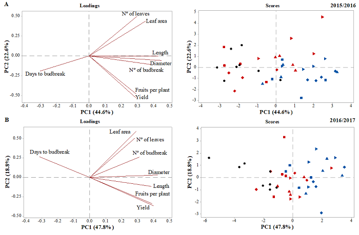 The PCA of both fig and vegetative performance explained 67.2% (2015/2016) and 66.6% (2016/2017) of the data variation with the first two components (PC1 + PC2) (Figure 8A and B).