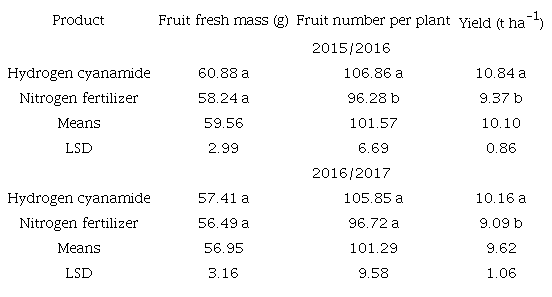 Comparing the two products in the 2015/2016 season, the highest of number of fruits per plant and yield were obtained in plants treated with hydrogen cyanamide, with averages of 106.9 fruits and 10.8 t ha-1, corresponding to the increase of 11.0 and 15.2, respectively, when compared to nitrogen fertilizer (Table 1). In 2016/2017 season, only yield (10.2 t ha-1) that received hydrogen cyanamide application were higher, being 12.2% higher than the values obtained with nitrogen fertilizer (9.1 t ha-1) (Table 1).